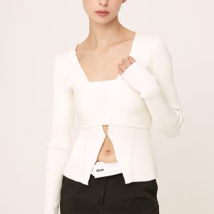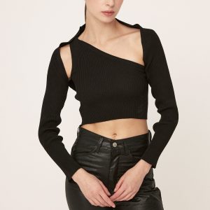 One shoulder knitted top and a bolero cardigan set Slightly shiny ribbed fabric Product Specification : 50% Rayon 45% Acrylic […]